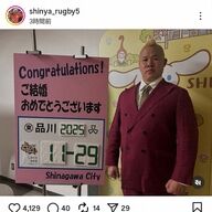 *テストマッチである会場で観戦していた時のこと。 「ニッポン!go! brave go!」ってものすごい声張ってる人がいるなぁ、気合い入ったファンだなぁと思ってたら、しんやさんだった。 しんやさんに気付き、友人たちと離れた席から手を振ったらにこやかに振り返して下さった。 ラグビーを盛り上げよう!たくさんの人に楽しんでもらおう!という心意気が伝わった。 この他にもこの会場でのしんやさんの立ち居振る舞いが素晴らしく、ラグビー日本代表もしんやさんも、さらに好きになった。 この度はご結婚、おめでとうございます。
