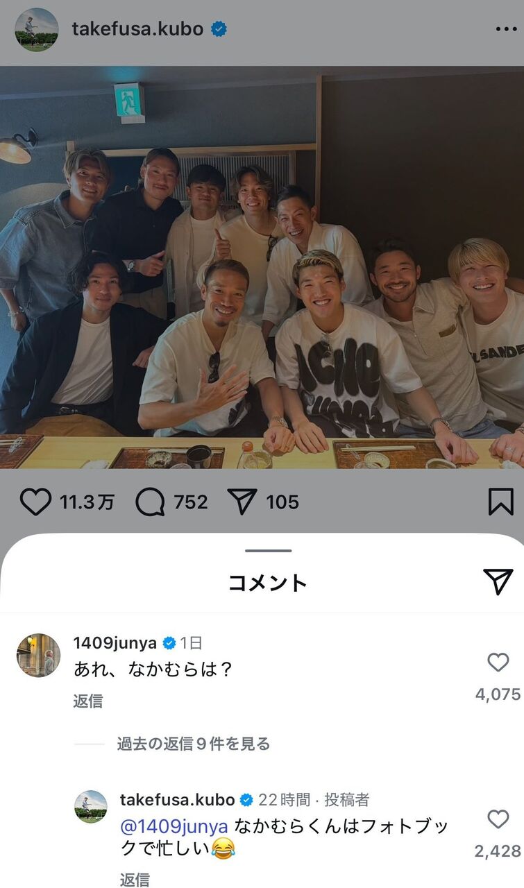 19日には「みんなありがとう!」として、サッカー界から豪華メンバーが集まった1枚を公開した。