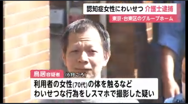 | トイレの個室で体触り、スマホで撮影も 認知症の70代女性にわいせつ行為か 50歳介護士を逮捕 東京・台東区 …東京・台東区のグループホームで介護士の男が認知症の女性にわいせつな行為をするなどした疑いで逮捕されました。 介護士の鳥居高宏容疑者(50)は6月ごろ… (出典:) |