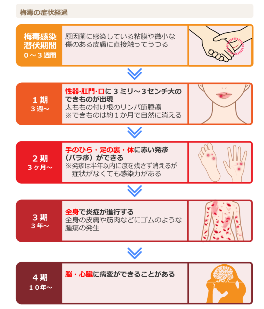 厚生労働省などによると、梅毒は梅毒トレポネーマという病原体により引き起こされる感染症。主に粘膜や皮膚の接触を伴う性行為で感染する。潜伏期間は約3週間。